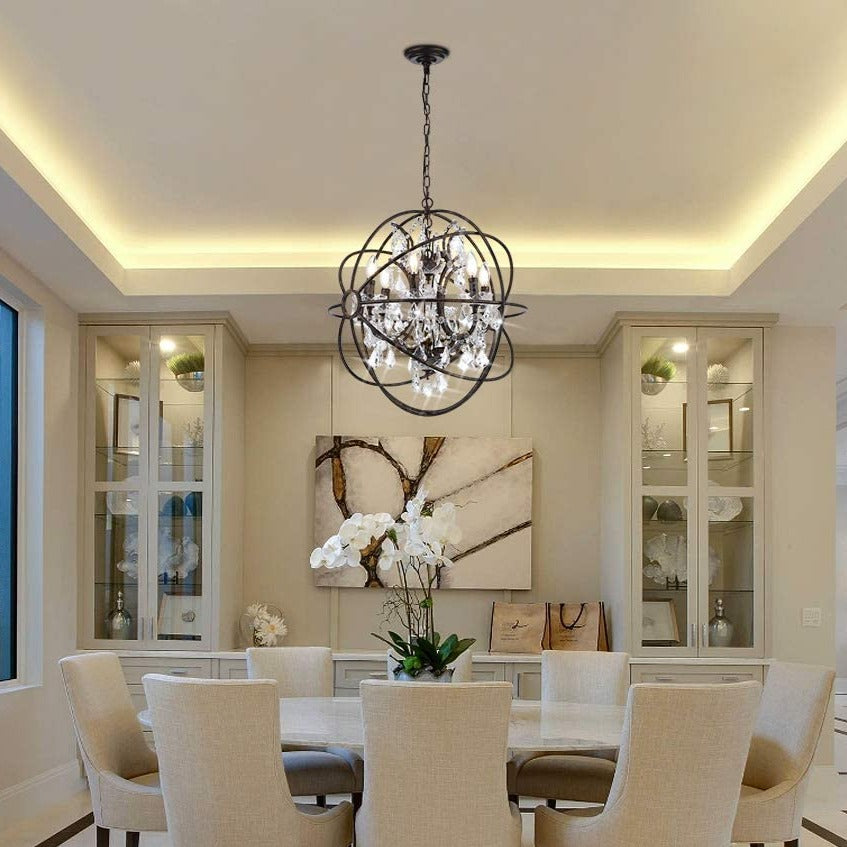 This gorgeous rustic 6-light globe chandelier is a one of a kind ceiling light that exudes an ethereal beauty. The strands of dulled bronze or nickel are delicately twisted into an enchanting candelabra with 6 candle-like light bulbs blossoming out from the fixture.
