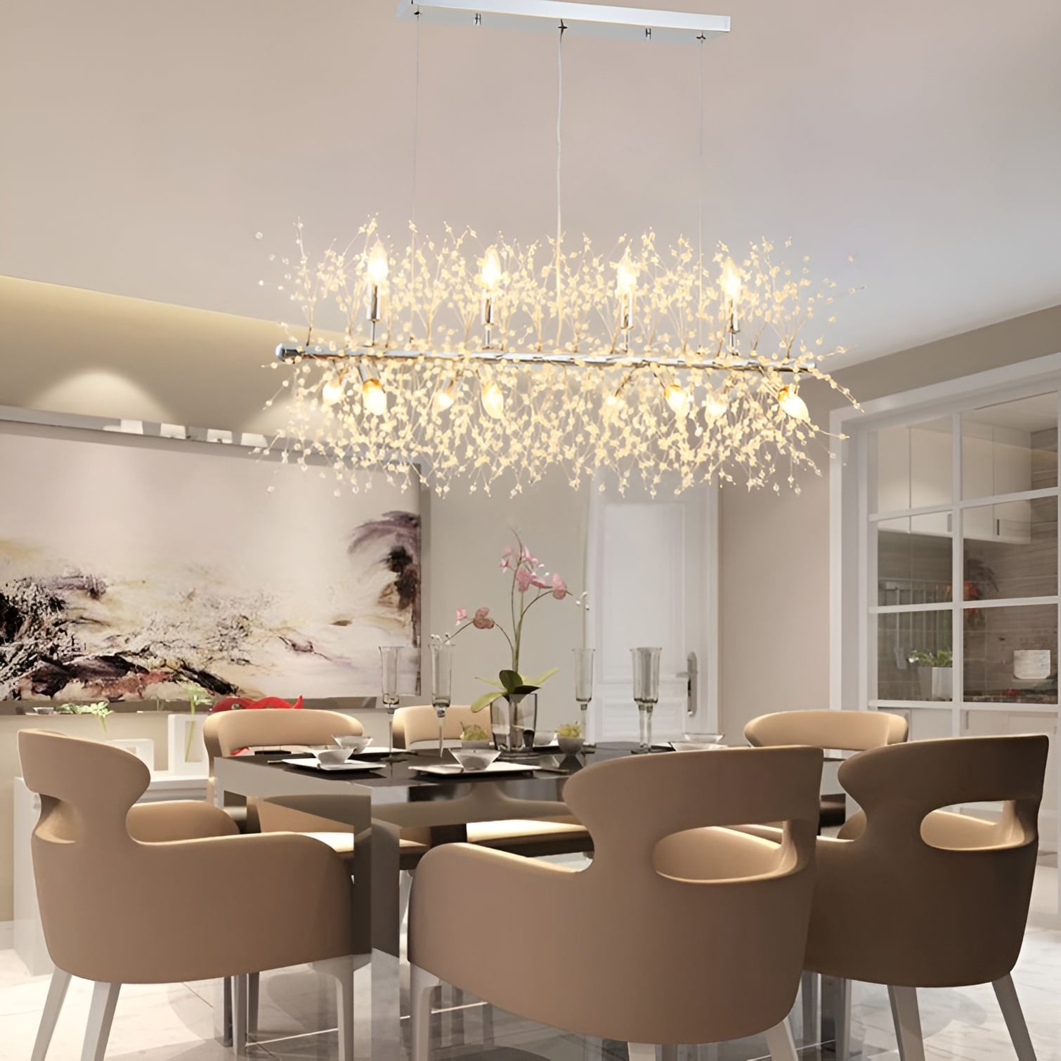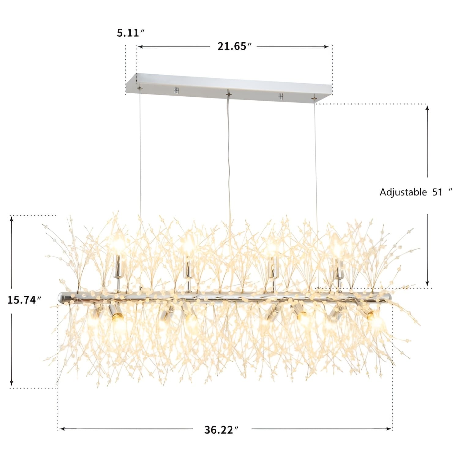 The DecoMust 12-Light Kitchen Island Linear Pendant with Crystal Accents is a stunning piece of lighting that will add glamour and sophistication to your kitchen. This pendant features a inside metal frame in a chrome finish that supports 12 candle-style lights. The frame is adorned with clear crystal accents that reflect and refract the light, creating a dazzling effect.