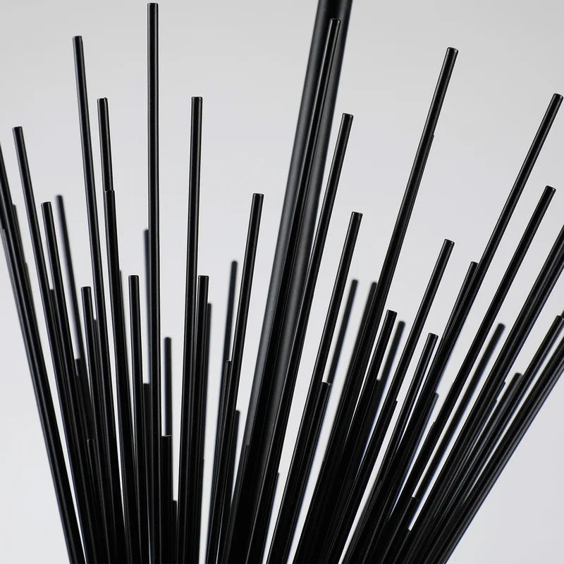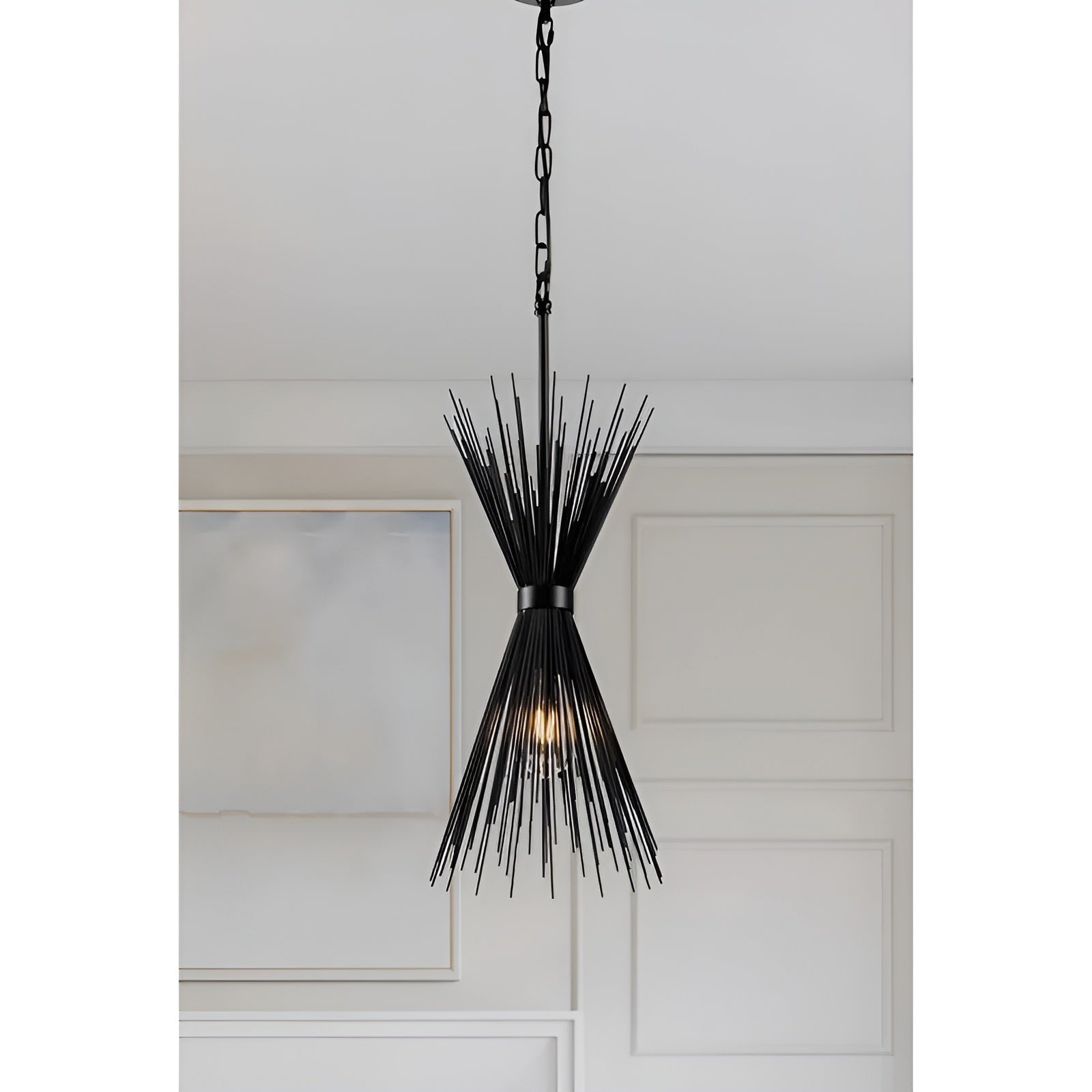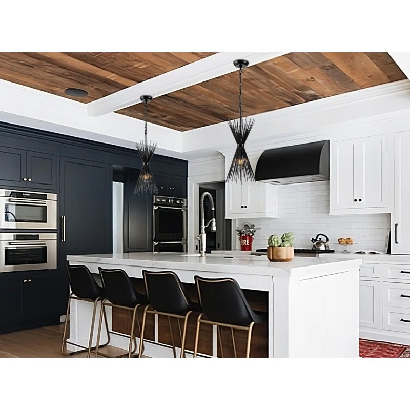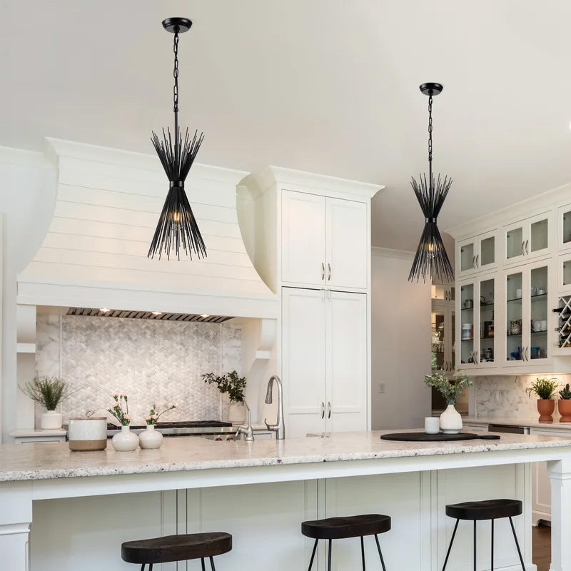 Add some drama and flair to your space with this unique statement pendant lamp from wrought studio. This lamp features a sputnik design with 12 metal spikes that radiate from a central bulb, creating a striking and eye-catching effect. The lamp has a matte black finish that contrasts with the warm glow of the light, giving it a contemporary and industrial look.