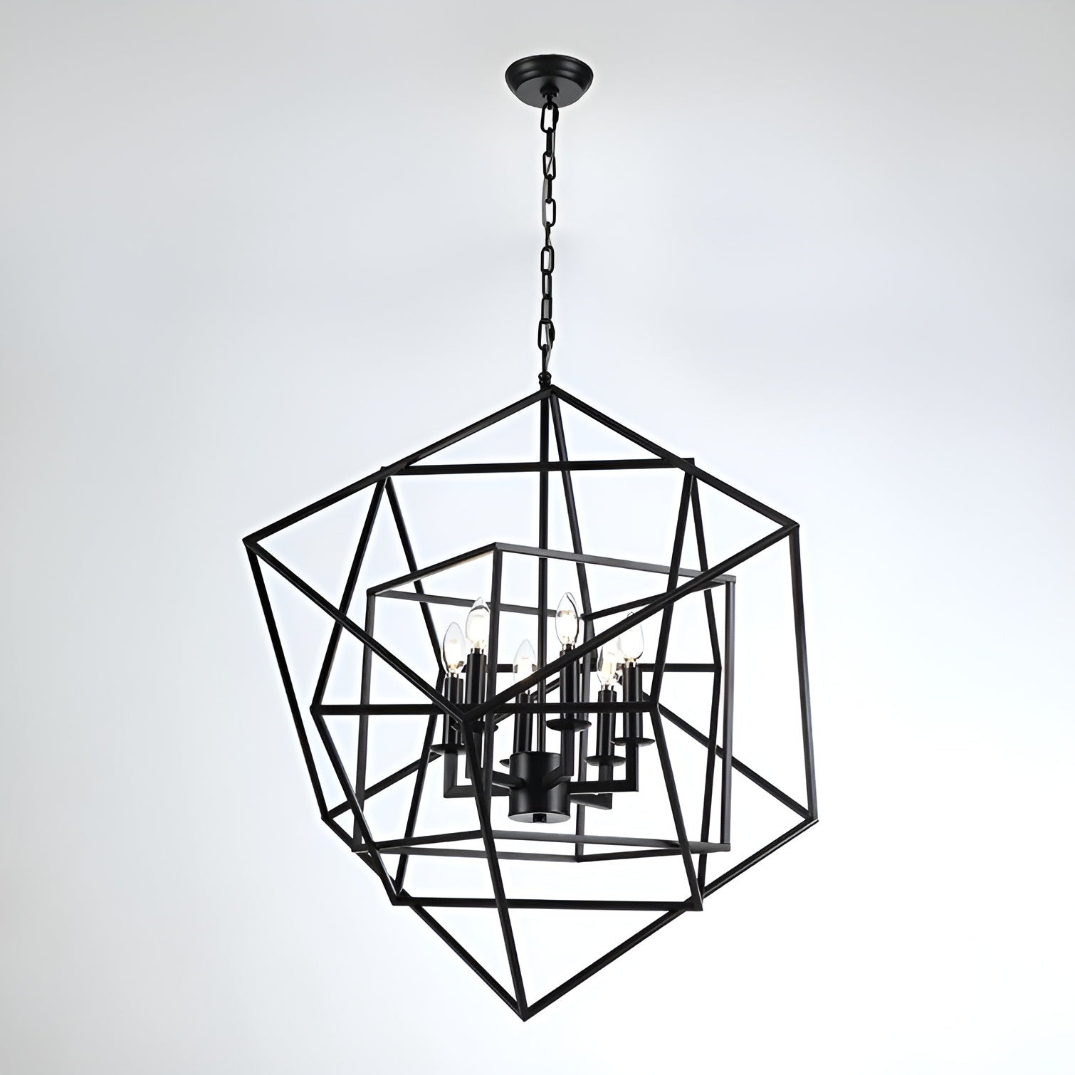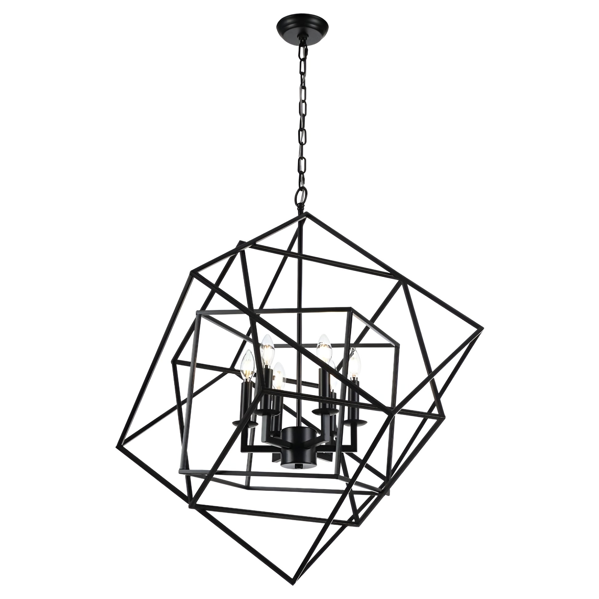 Illuminate your space in style with this 6-light geometric chandelier. This pendant is made of steel metal and features a unique sci-fi modern design. It has a circular base plate and an adjustable hanging chain. Its shade features an open frame of nesting cube shapes, offering a distinctive modern & minimalist look.