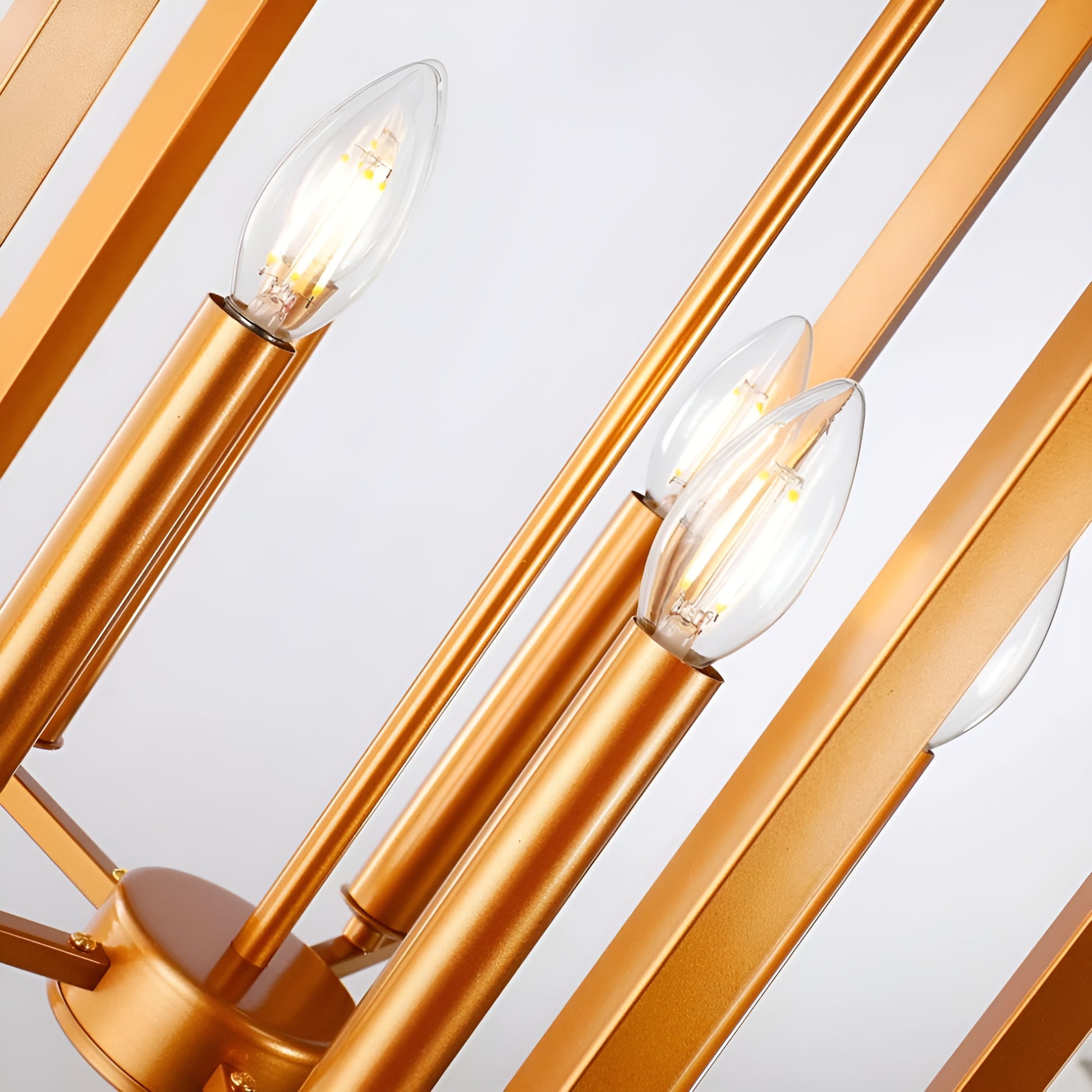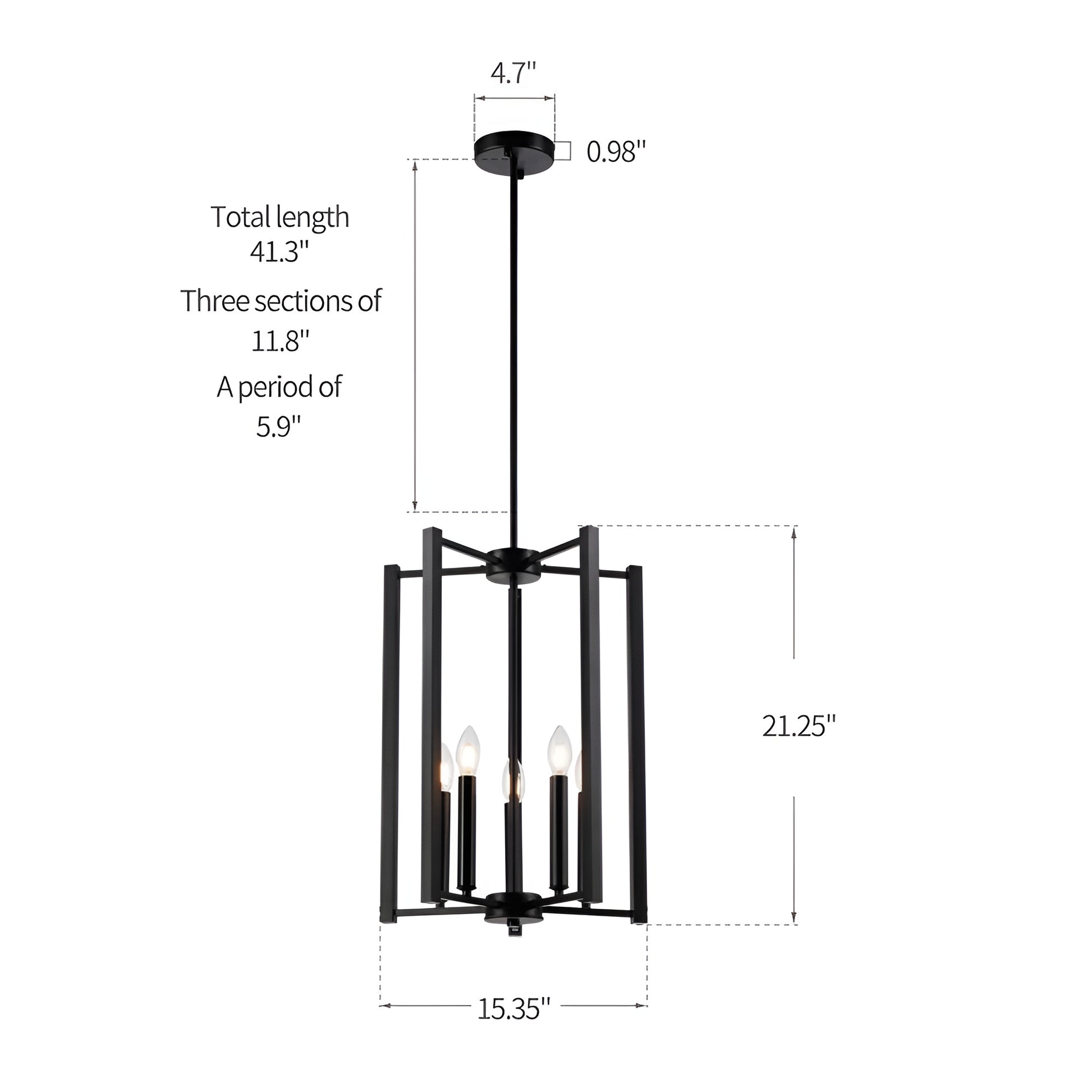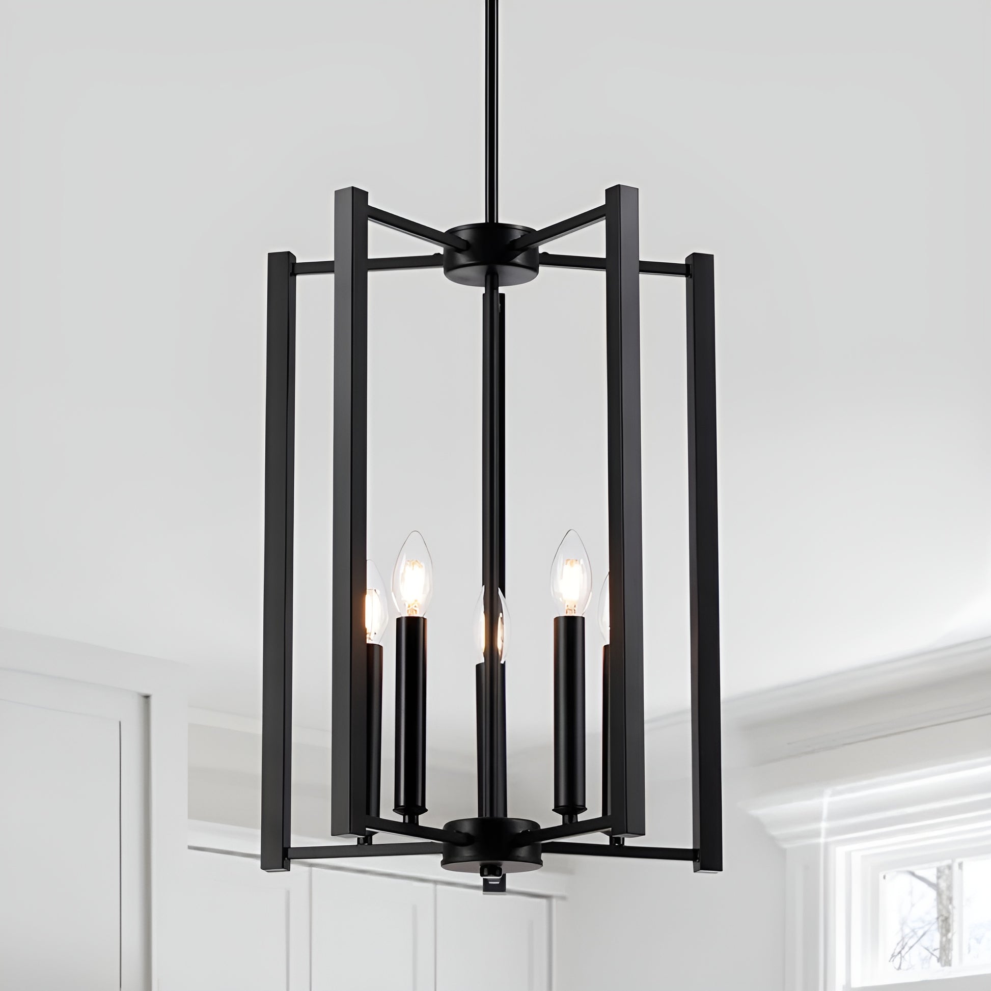 Add geometric-style flair to your interior space with this modern pendant light chandelier. This five-light chandelier features a matte black or gold finish with a minimalist modern style. The five-light design creates ample light with the candle style (E12) bulb cases.