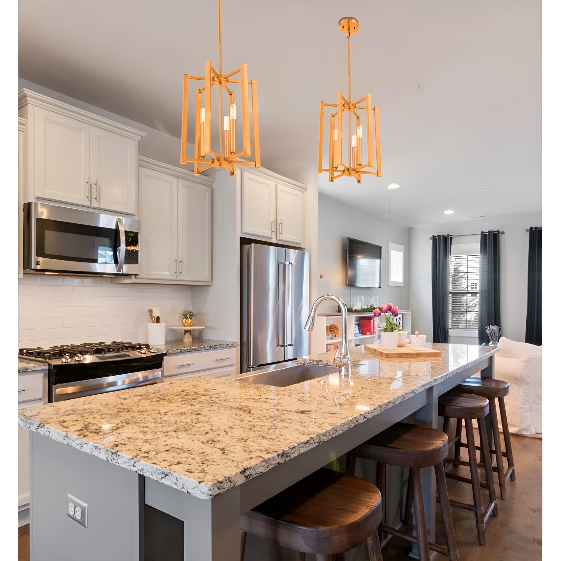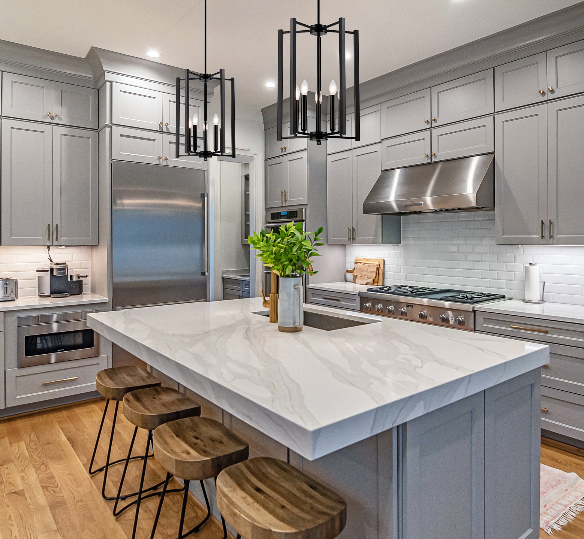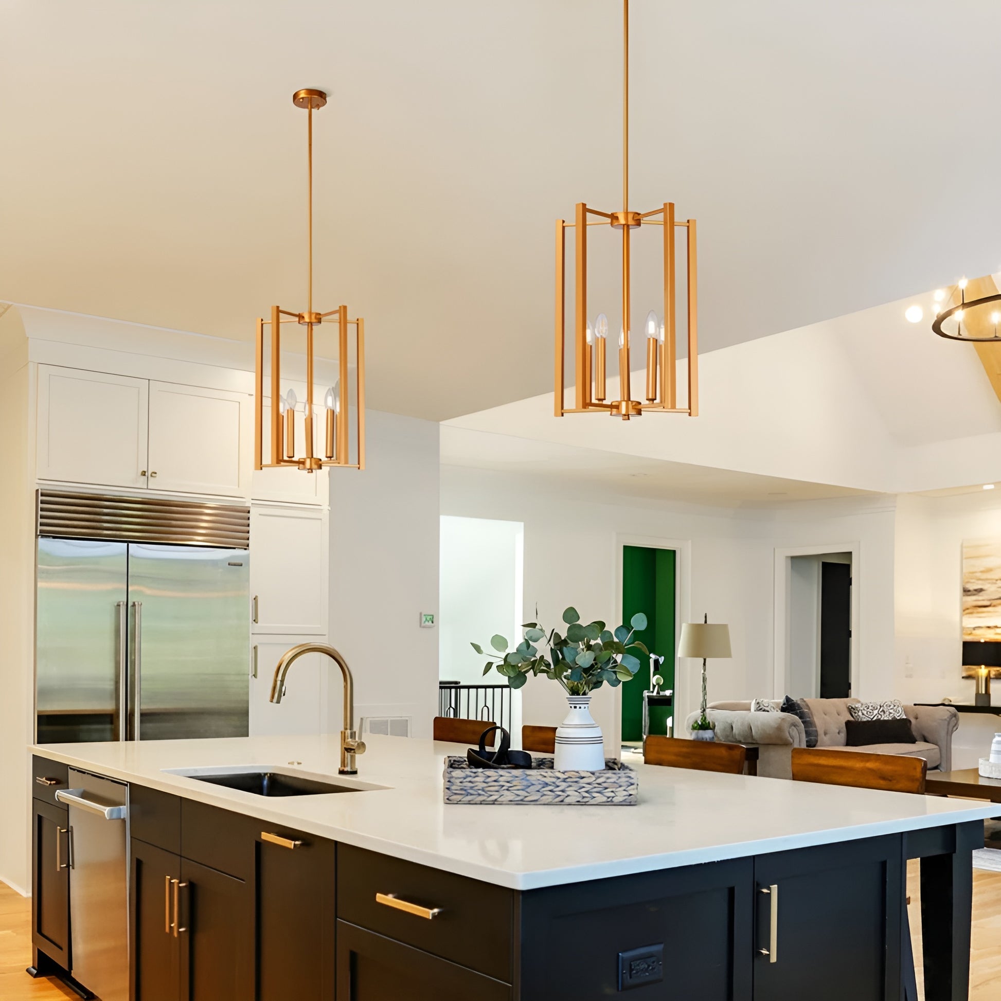 Add geometric-style flair to your interior space with this modern pendant light chandelier. This five-light chandelier features a matte black or gold finish with a minimalist modern style. The five-light design creates ample light with the candle style (E12) bulb cases.