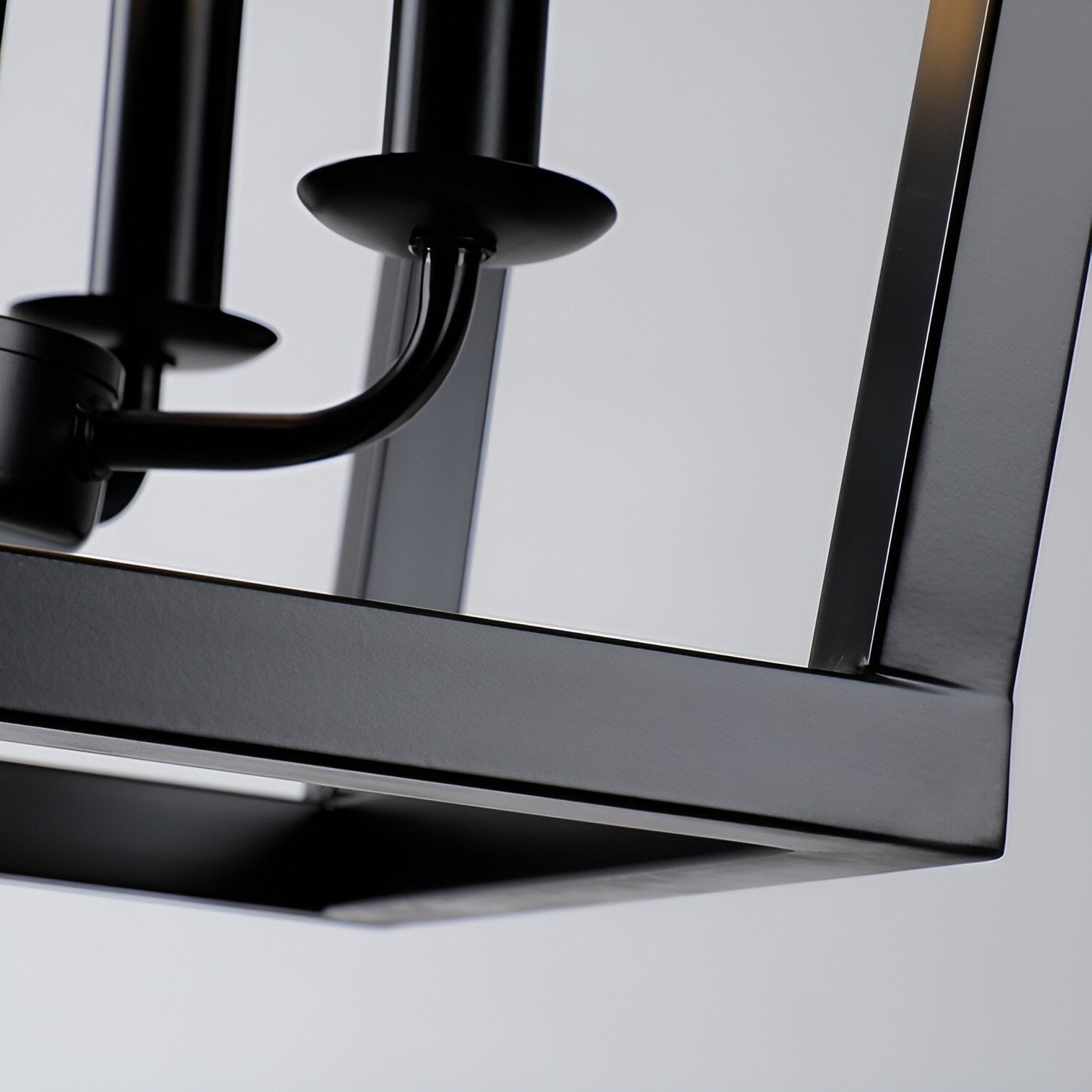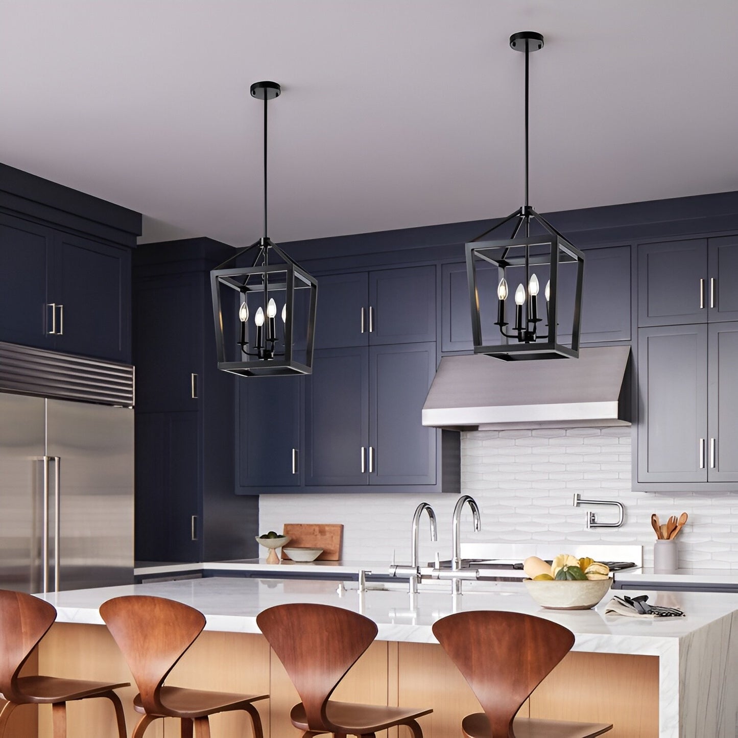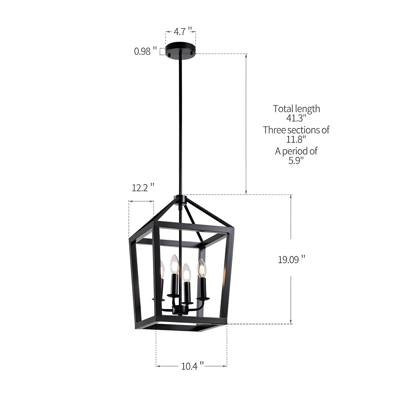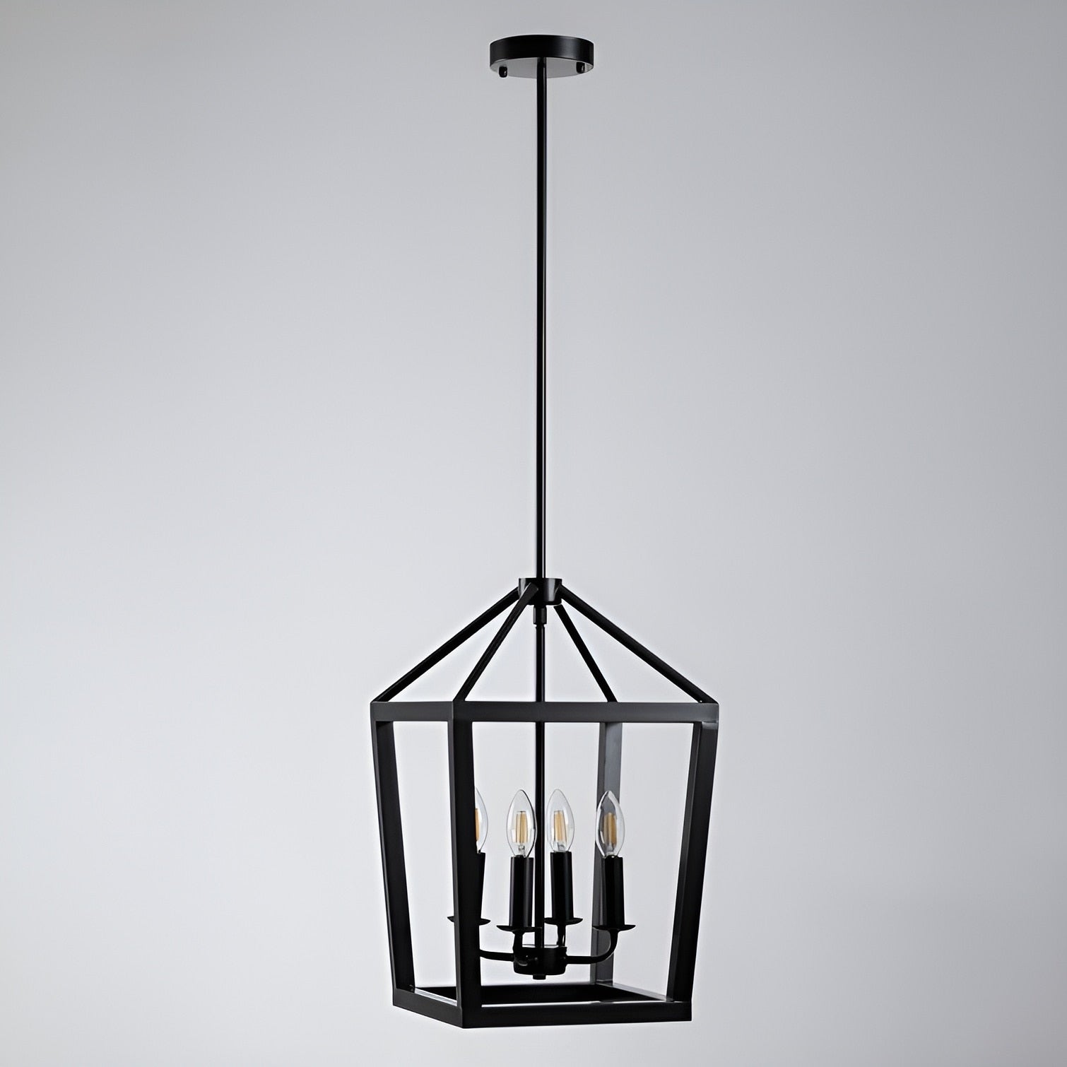 The fixture boasts a circular canopy, a slim downrod, and an open-frame lantern silhouette, creating a visually appealing and versatile lighting solution. At its center, a candelabra-style fixture awaits, ready to showcase four standard candle-shaped bulbs (sold separately). The pendant light is height adjustable, allowing you to customize it to suit your space, and it's dimmer-switch compatible, enabling you to set the perfect mood for any occasion.