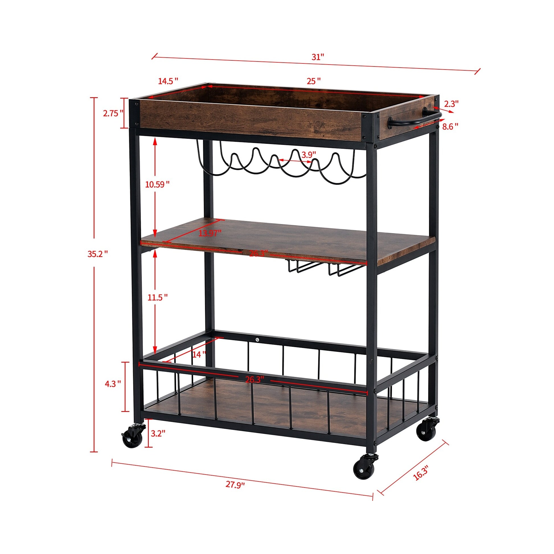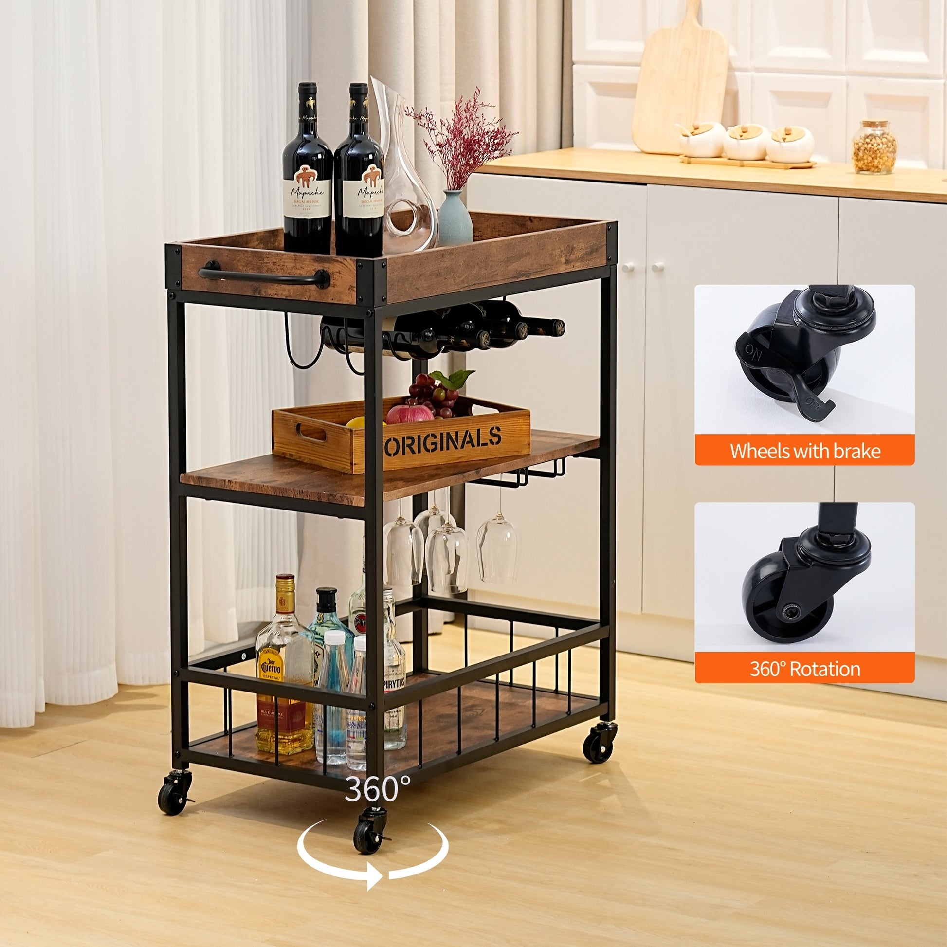 Industrial Kitchen Serving Trolley Bar Cart (Brown) - Vintage Style Rustic Wine Rack & Glass Storage, Tallman Mobile Bar Cart
