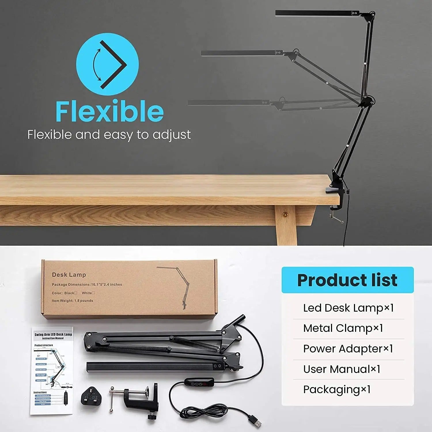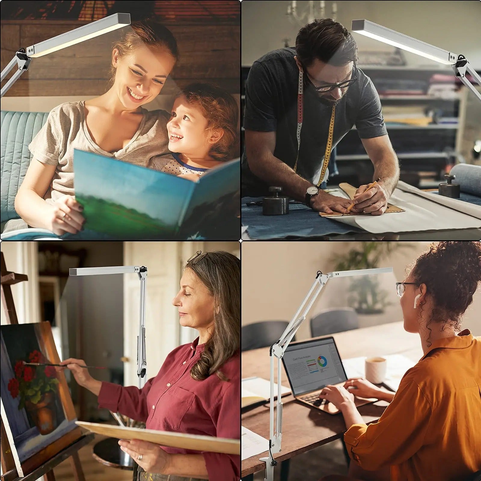 LED Desk Lamp with Clamp Long Arm Table Lamp Eye-Caring Dimmable 3 Colors Adjustable Desk Light with 10 Brightness Level