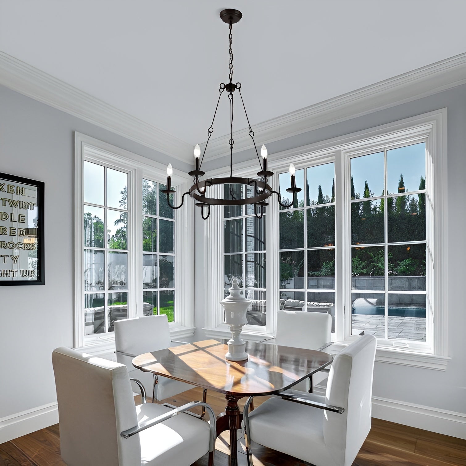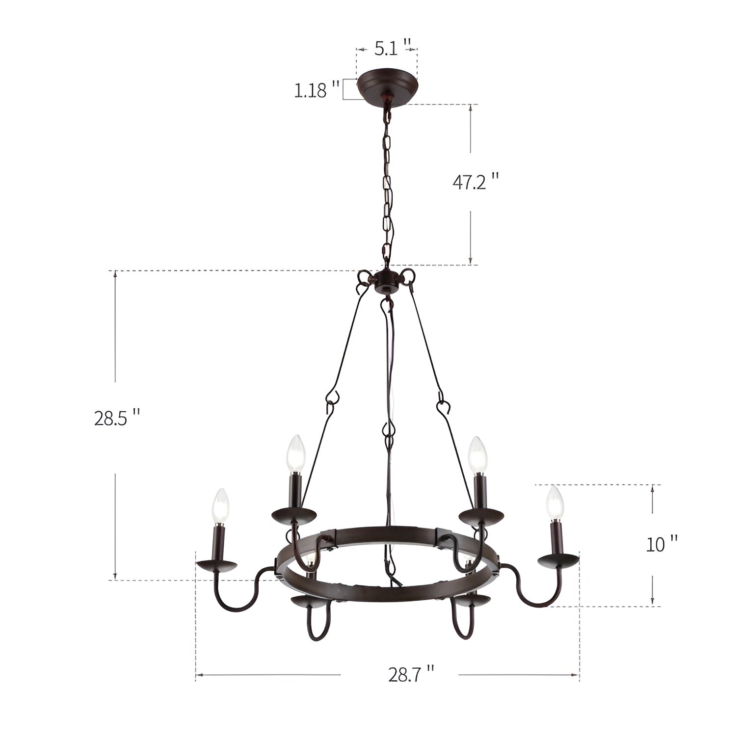 Elevate your space with the DecoMust 6-Light 28-Inch Metal Wagon Wheel Chandelier, a stunning blend of rustic charm and contemporary classic/medieval design. This remarkable chandelier features a captivating hollow wagon wheel design with six radiant lights, creating a striking focal point for any room. The sleek finish adds a touch of sophistication, making it a versatile addition to various interior styles.