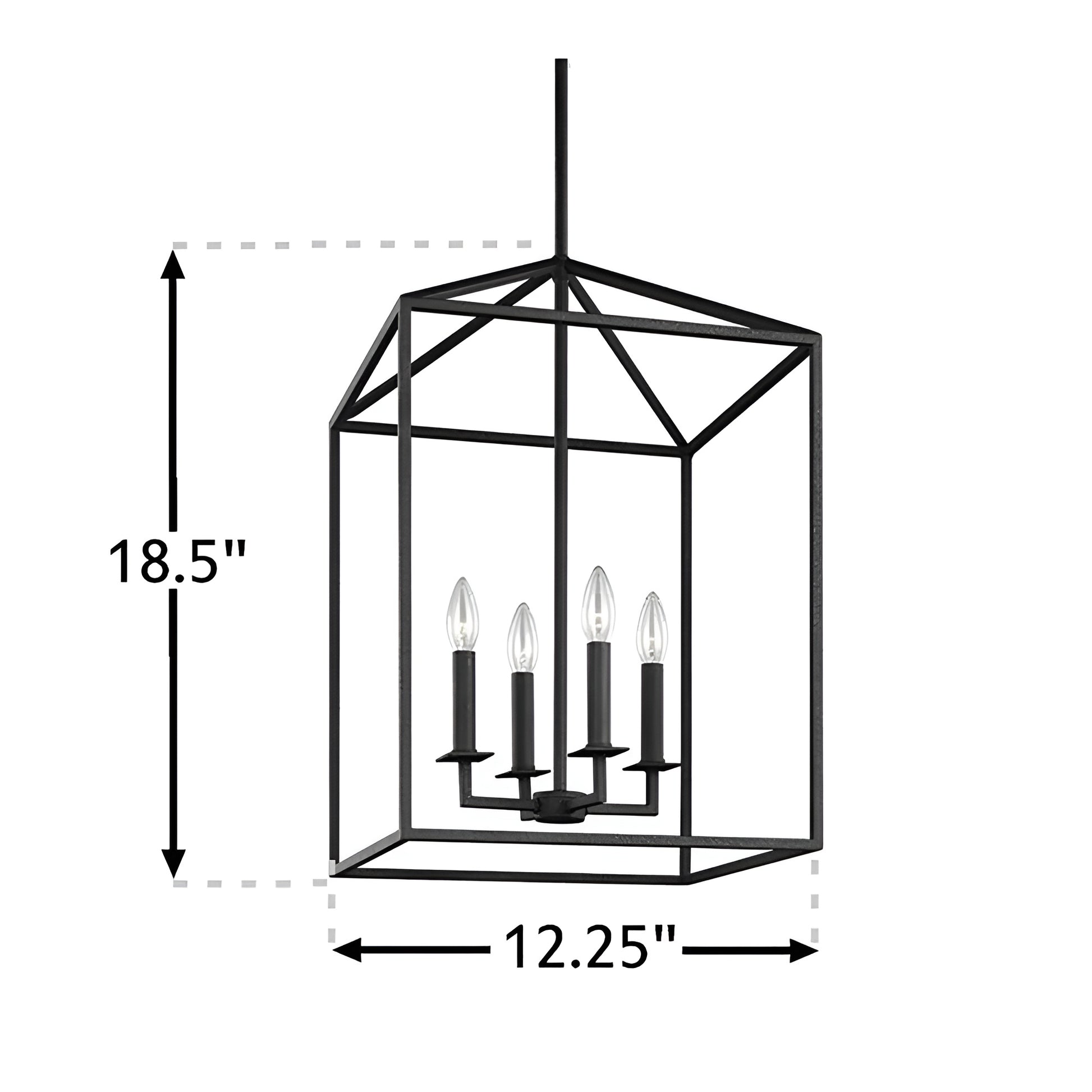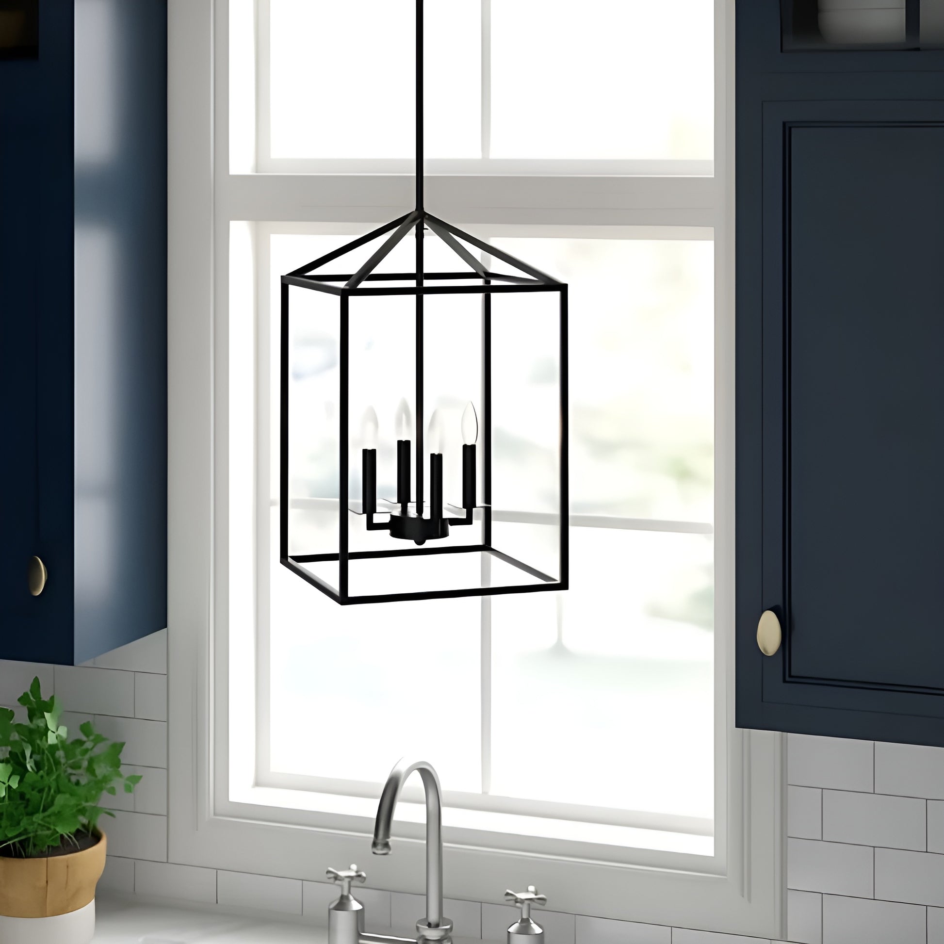 This fixture features a canopy, a slim downrod, and an open-frame lantern silhouette. A candelabra-style fixture sits at its center, topped with four standard candle-shaped bulbs (sold separately). Best of all, this versatile pendant light is height adjustable to suit your space and dimmer-switch compatible to set the mood.