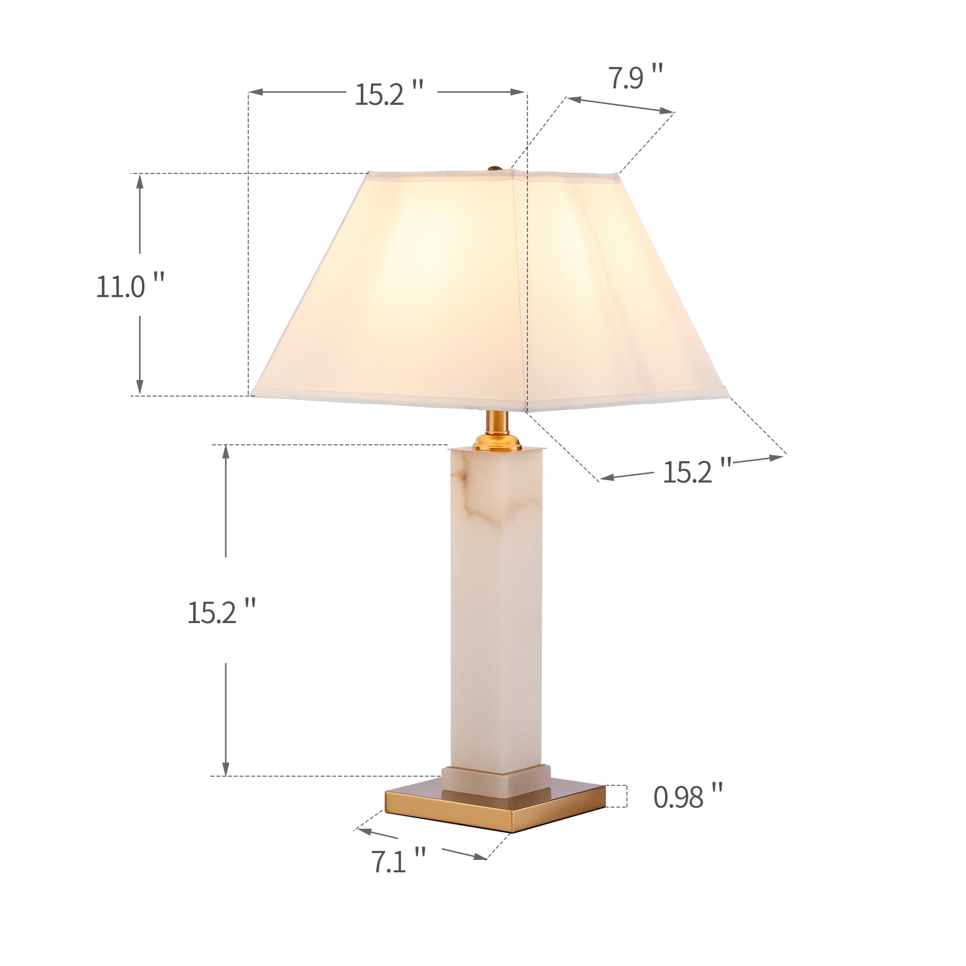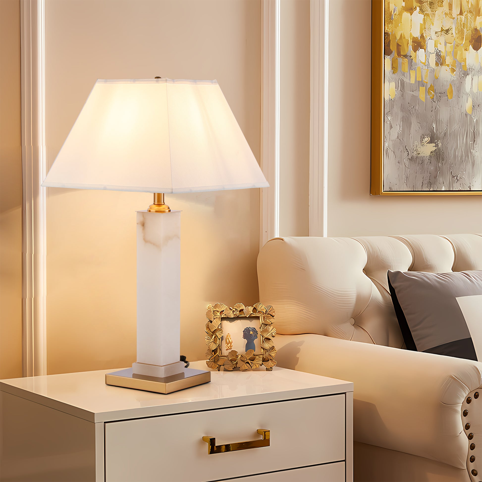 Illuminate your space with our exquisite "White Alabaster Gold Metal Table Lamp," featuring a chic rectangular shade for a touch of modern elegance. This contemporary lighting fixture is designed to enhance your stylish home decor, seamlessly blending a crisp white alabaster base with luxurious gold metal accents.