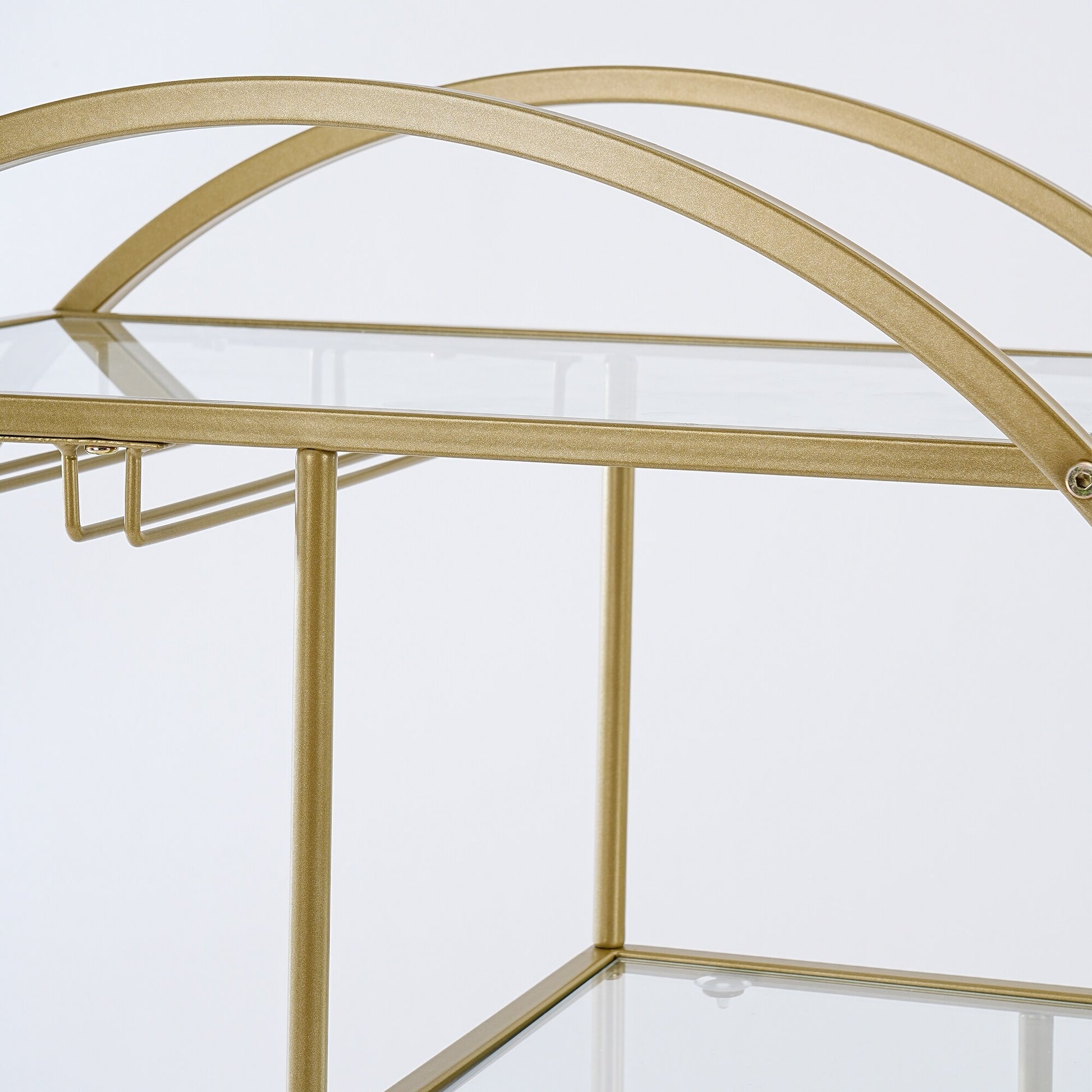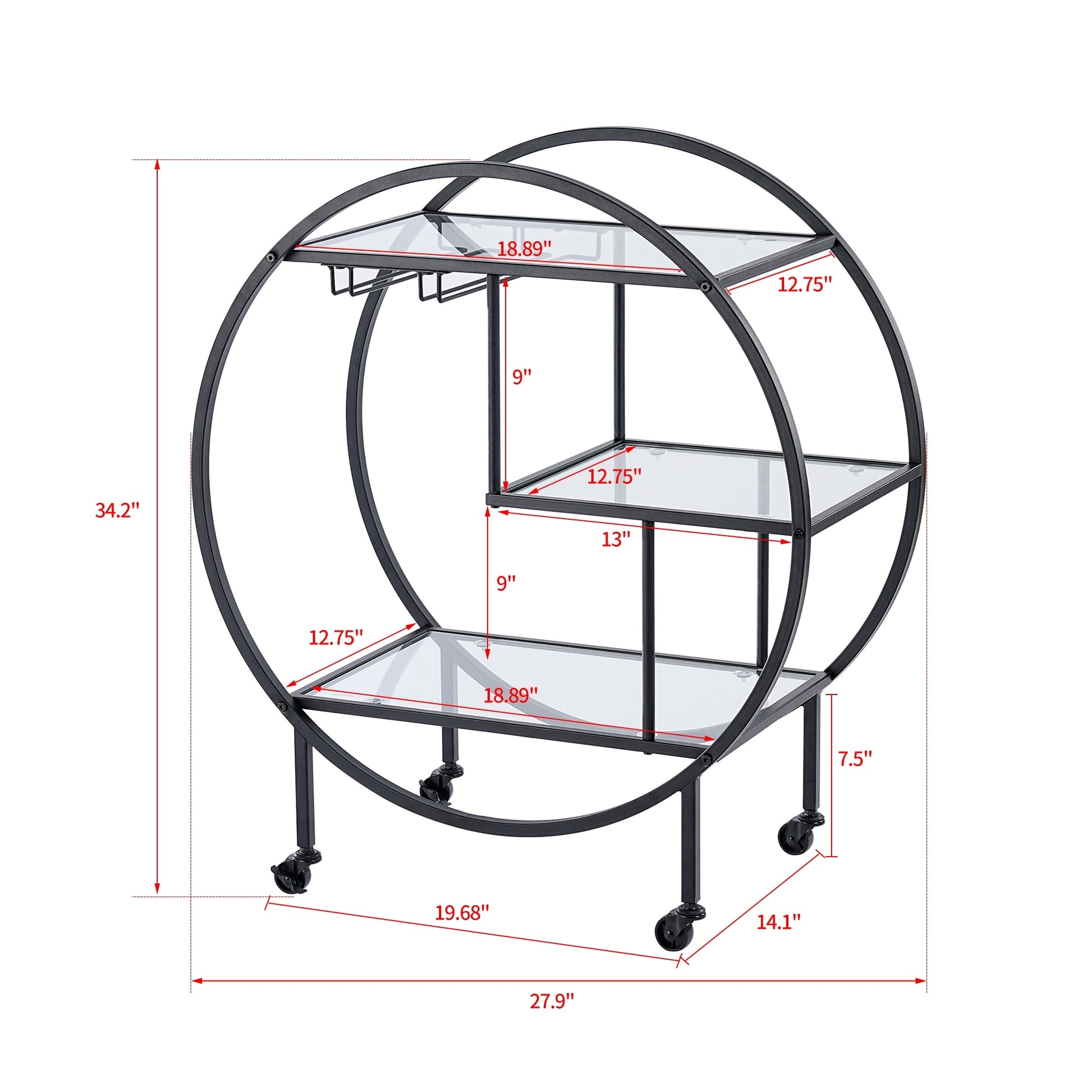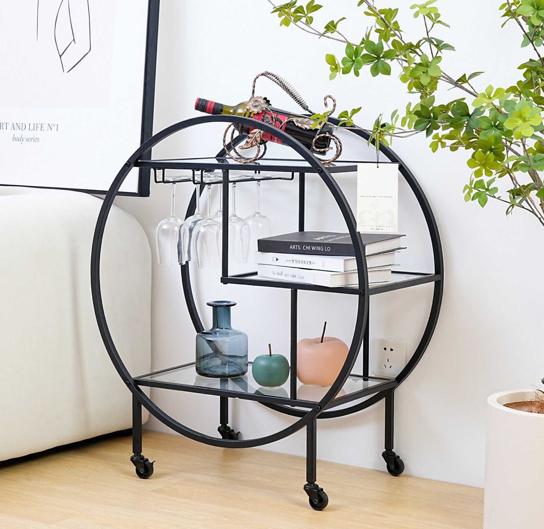 Enjoy your living room, patio or bar in style with this circular mini bar cart. Crafted from metal, this piece features a double frame for a layered look from every angle, allowing it to fit in with aesthetics from mid-century to glam. We love that the three tempered glass shelves are easy to clean and just right for displaying accent pieces, bar essentials, and glasses in your dining room. In addition, the casters make it easy to maneuver from one room to the next, or wherever the party goes. Each shelf has a weight capacity of 30 lbs.