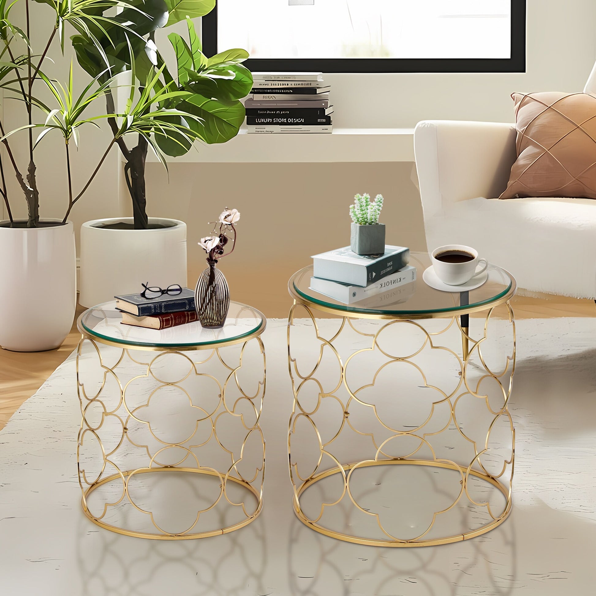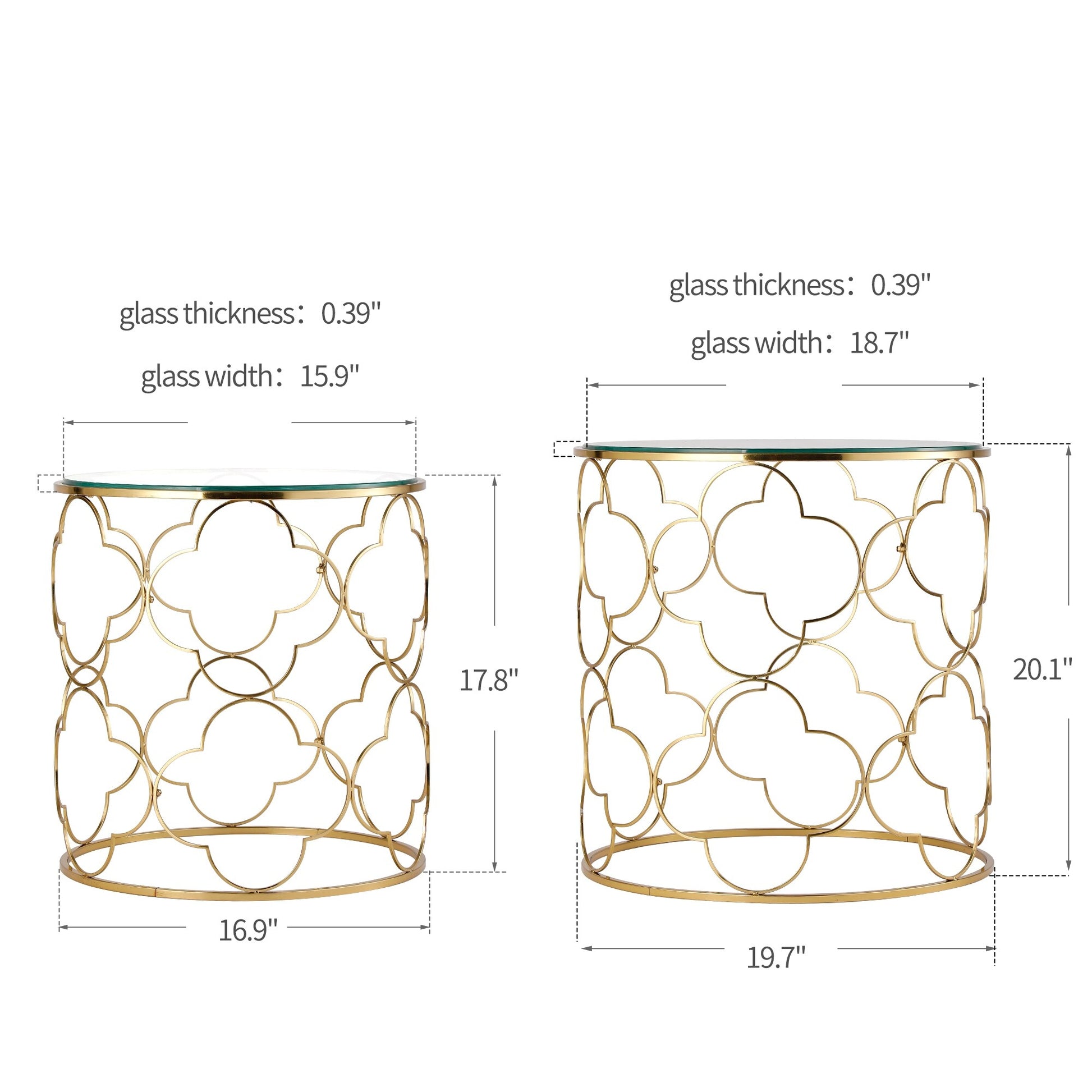 Crafted with high-quality tempered glass and a metal frame, these tables ensure durability and stability (up to 66lbs). The smooth and waterproof tabletops make cleaning and maintenance a breeze. The simple and elegant design effortlessly blends with any decor style, while the round shape and gold finish add a touch of sophistication.